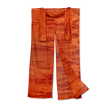 somewhat sheer copper orange crinkle with a diagonal grid of gold metallic emblems |